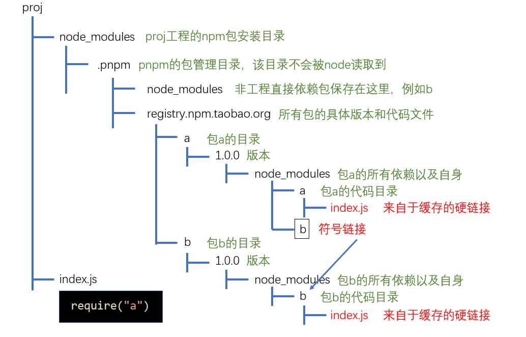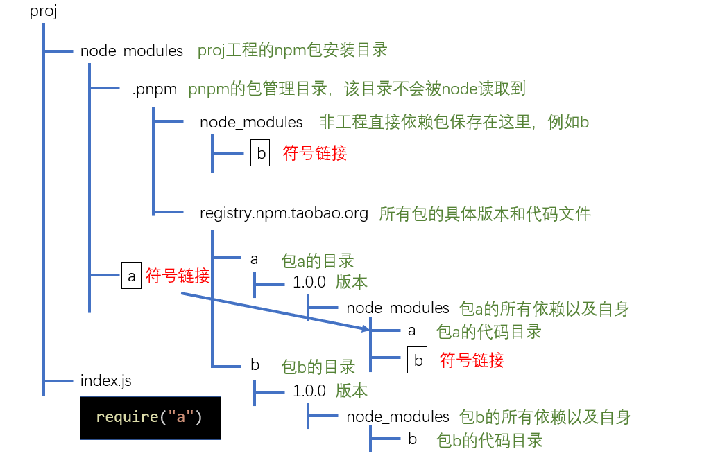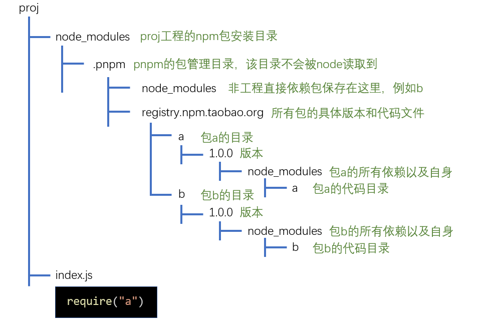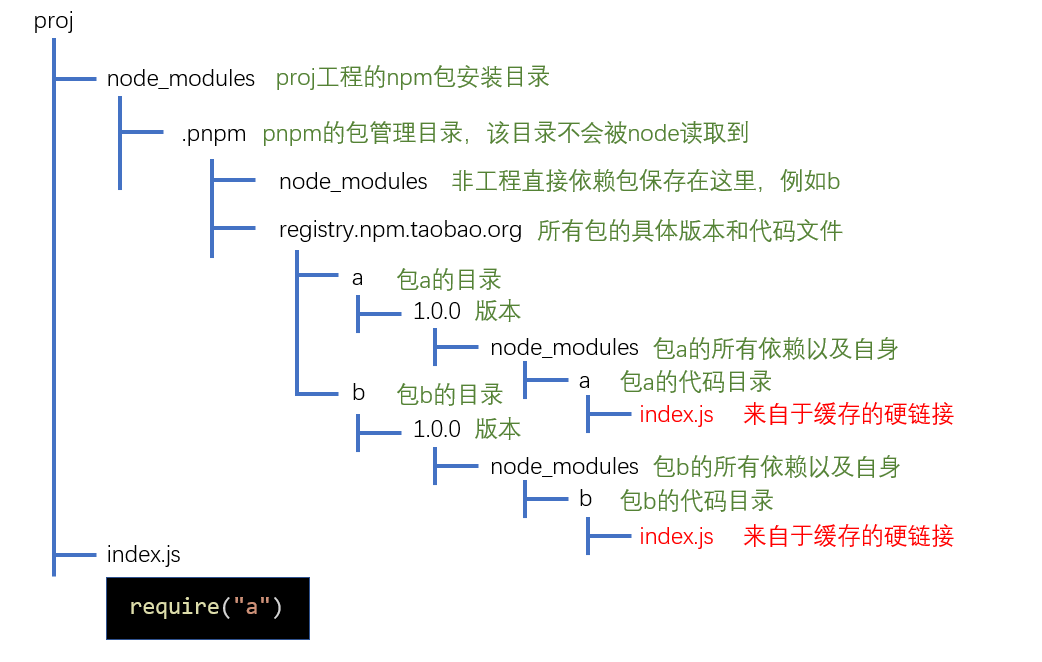 假设我们的工程为proj,直接依赖a,则安装时,pnpm会做下面的处理